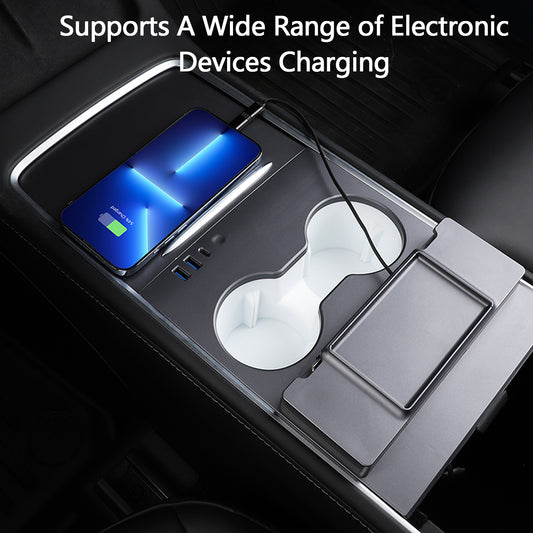 TOPABYTE Center Console USB Hub with Fast Charging Retractable Cable & Ambient Lighting for Model 3 Y (2021-2023)